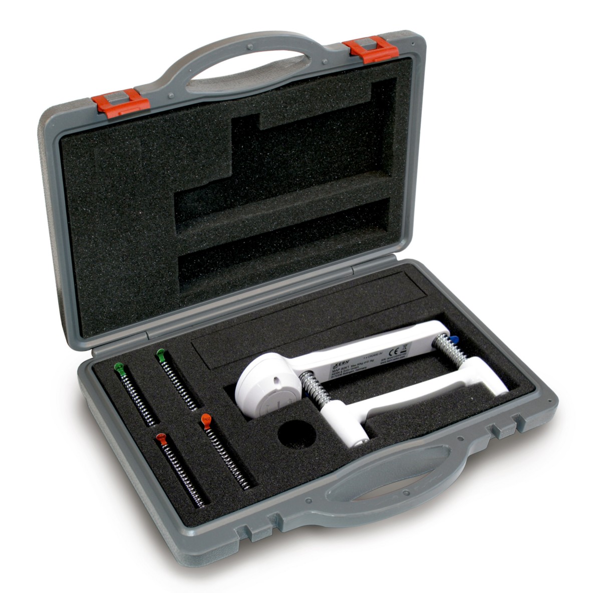 - Výměnné pružiny umožňují rychlou změnu rozsahu měření a přizpůsobení různým skupinám pacientů (děti, senioři, sportovci). Součástí dodávky je pevné ochranné pouzdro pro bezpečný transport a uložení přístroje i pružin.